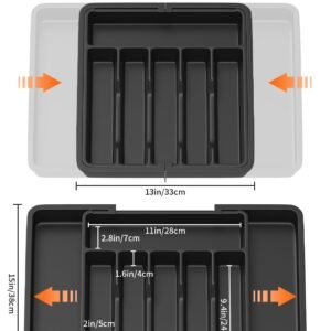 Cutlery Drawer Organiser, 33-57CM Expandable Utensil Tray for Kitchen with 8 Compartment Holders, Adjustable Silverware and Flatware Holder, Compact Plastic Storage Insert for Spoons Forks Knives
