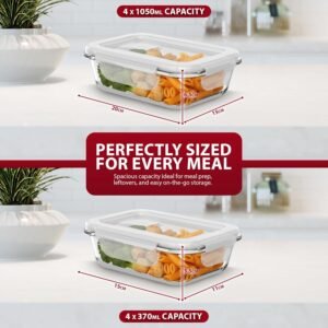 ZENO Glass Containers with Lids 8 Pack | Meal Prep Containers | Glass Food Container with Lid, Airtight Seal, Leakproof Lid | Dishwasher Safe | Freezer & Microwave Safe | 4 X 1050ml + 4 X 370ml