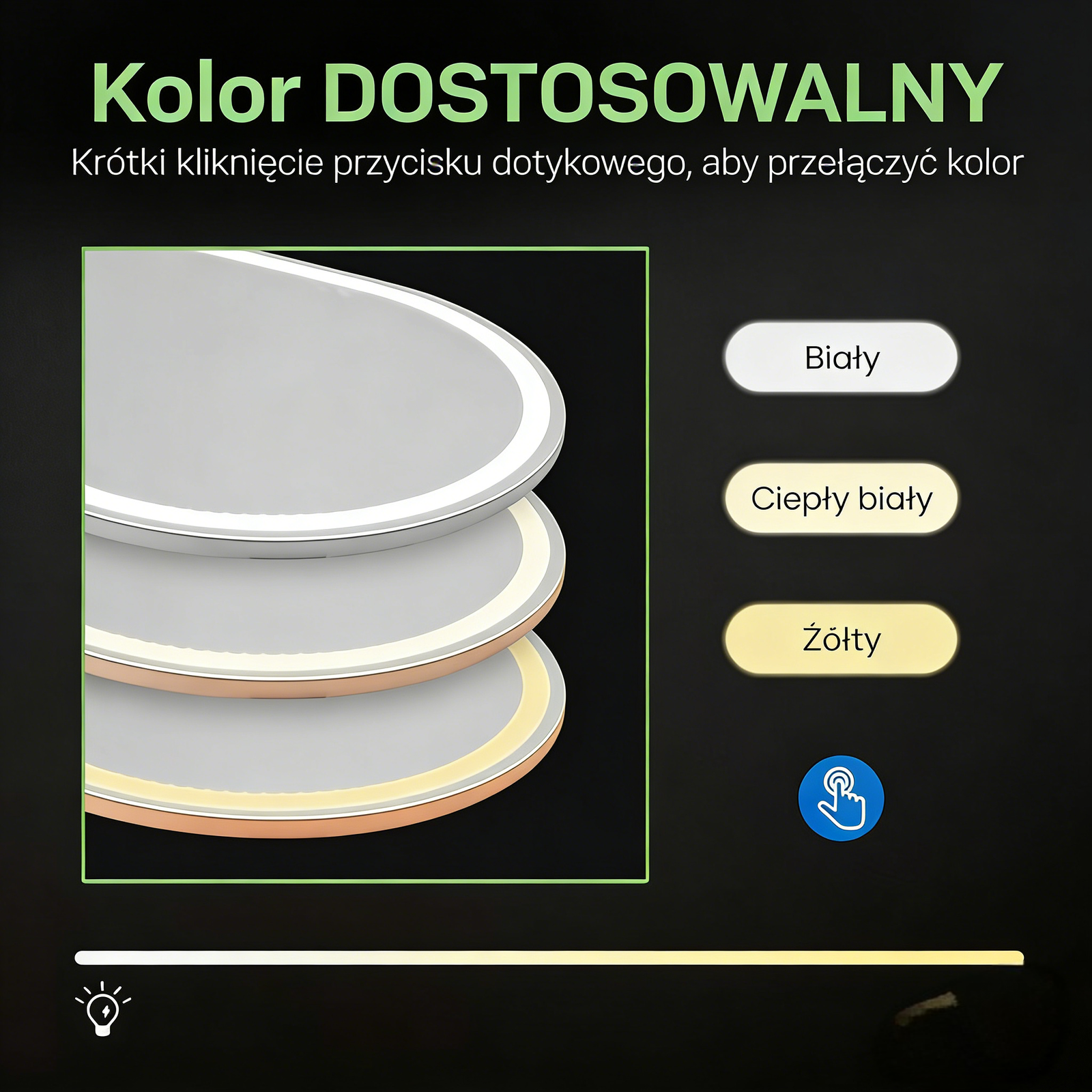 • Ciepły żółty (warm white): Dodaje ciepła i komfort – idealne na wieczory, gdy chcesz sprawdzić strój na spotkanie lub po prostu cenić się w przytulnym świetle.​